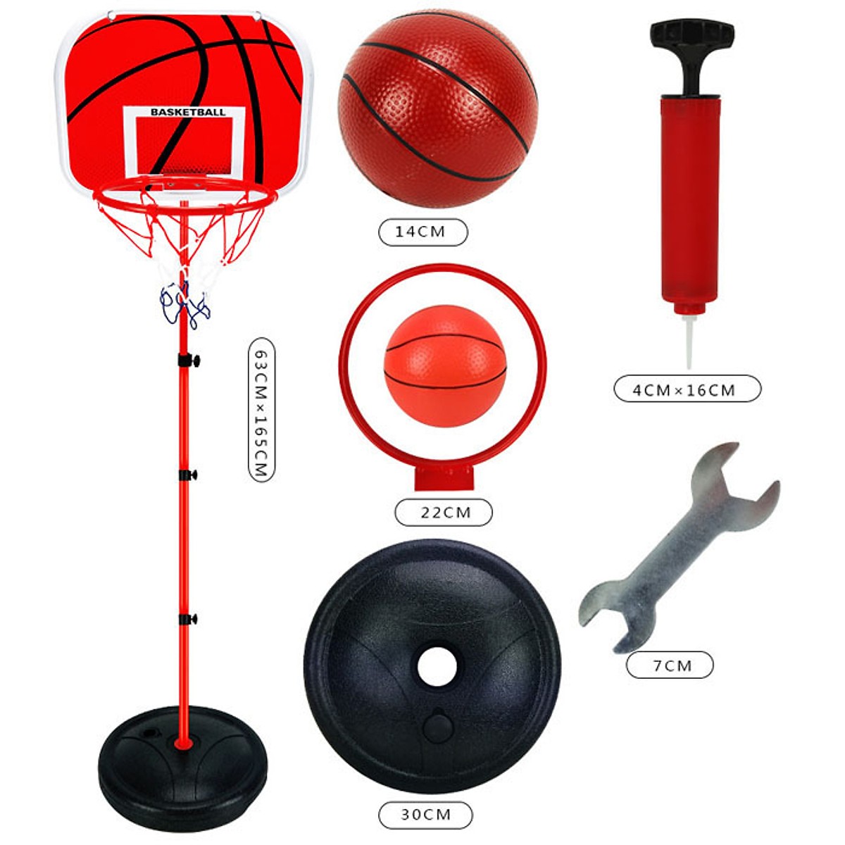 - 01 bóng rổ, 01 lưới, 01 rổ dùng để cài lưới đựng bóng, 01 chân đế, 3 cột ghép.