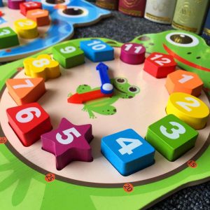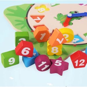 🍀 Cách chơi: Bé xếp các hình khối vào đúng khuôn của đồng hồ, học đếm các số trên hình khối và nhận biết màu sắc hình khối đó đồng thời bé học cách xem giờ trên đó.