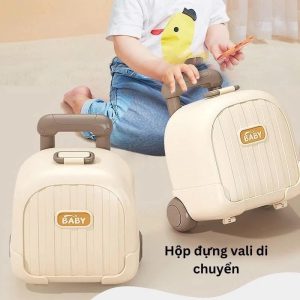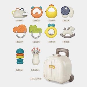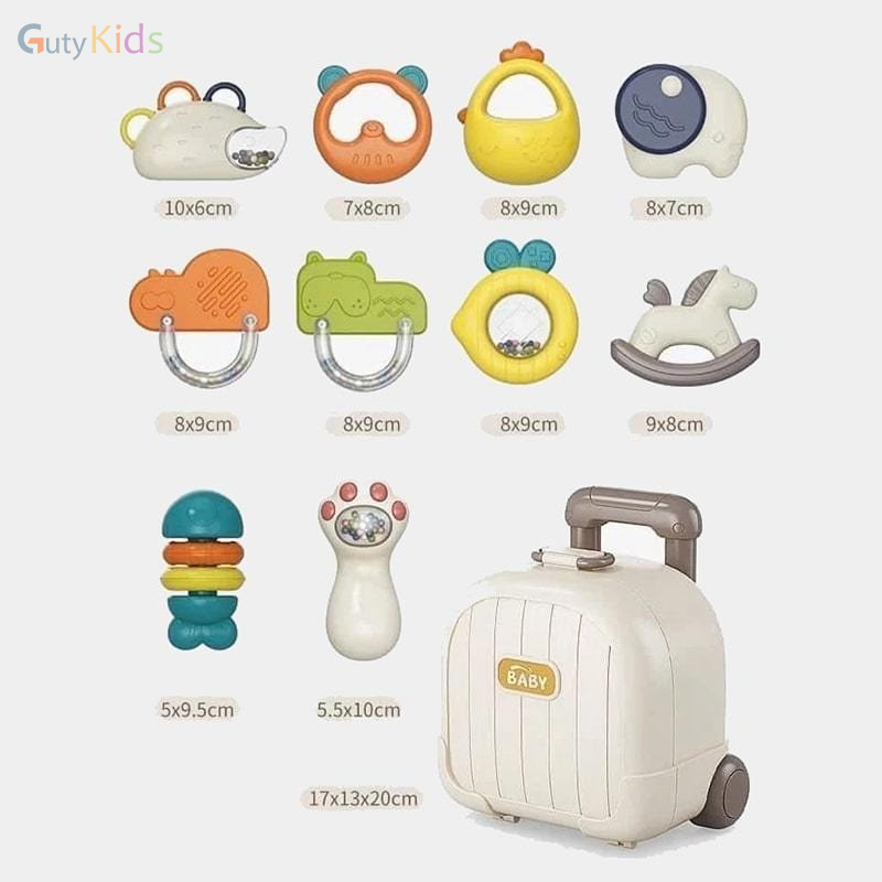- Bộ sản phầm gồm : hộp đựng vali có bánh xe, 10 chi tiết gặm nướu và xúc xắc cực kì dễ thương